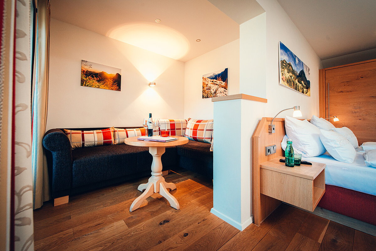 - grote woon-slaapkamer met tweepersoonsbed en bank