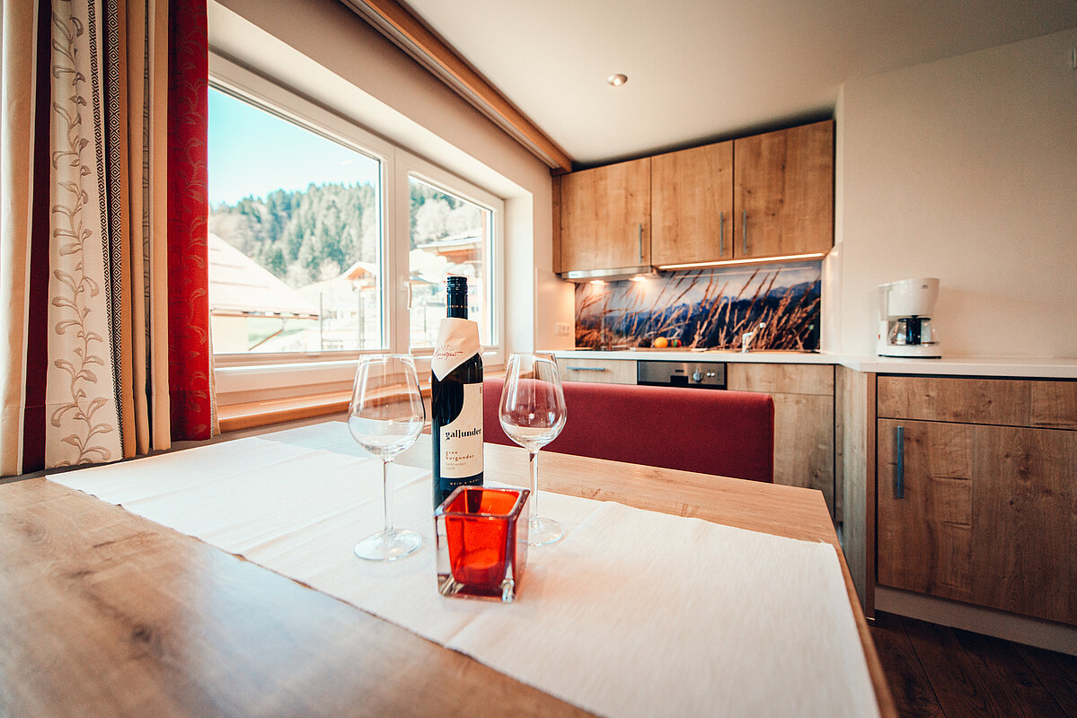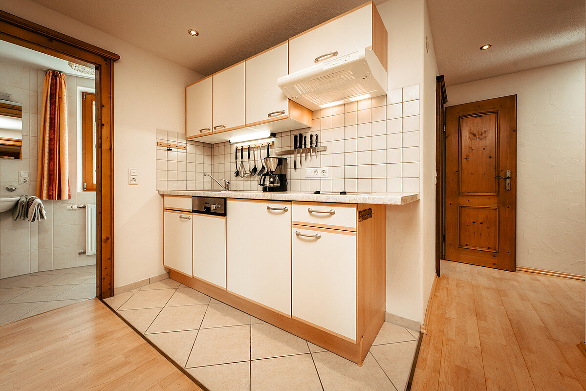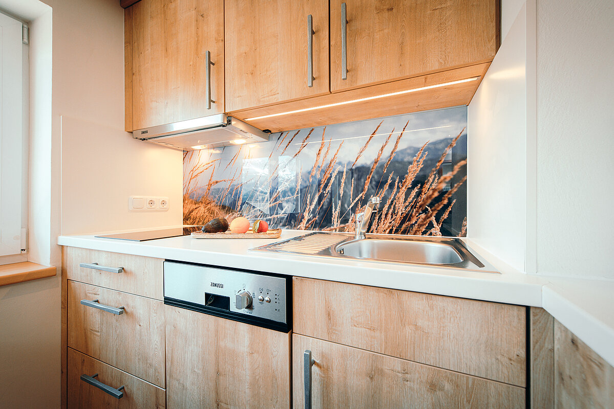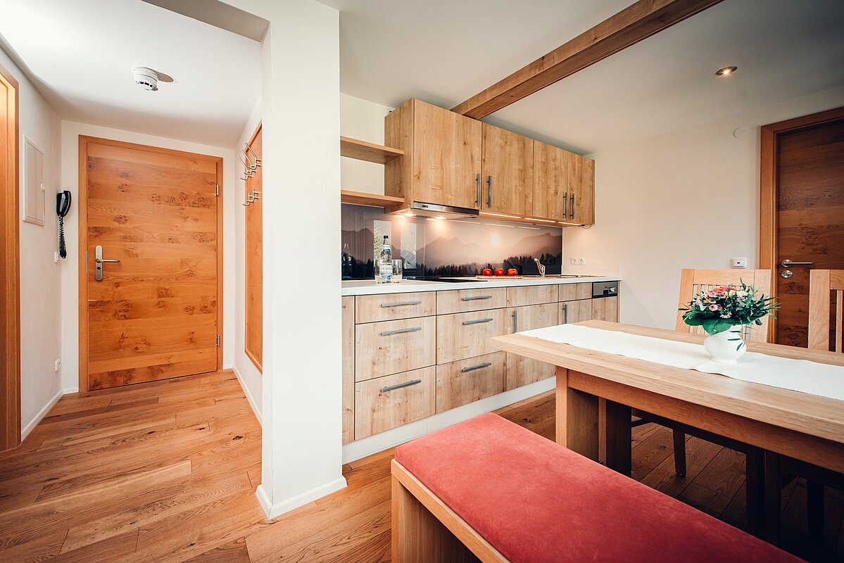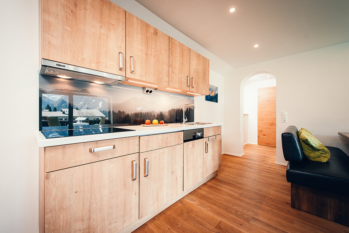 - woonkeuken met eethoek en bank, kitchenette met vaatwasser