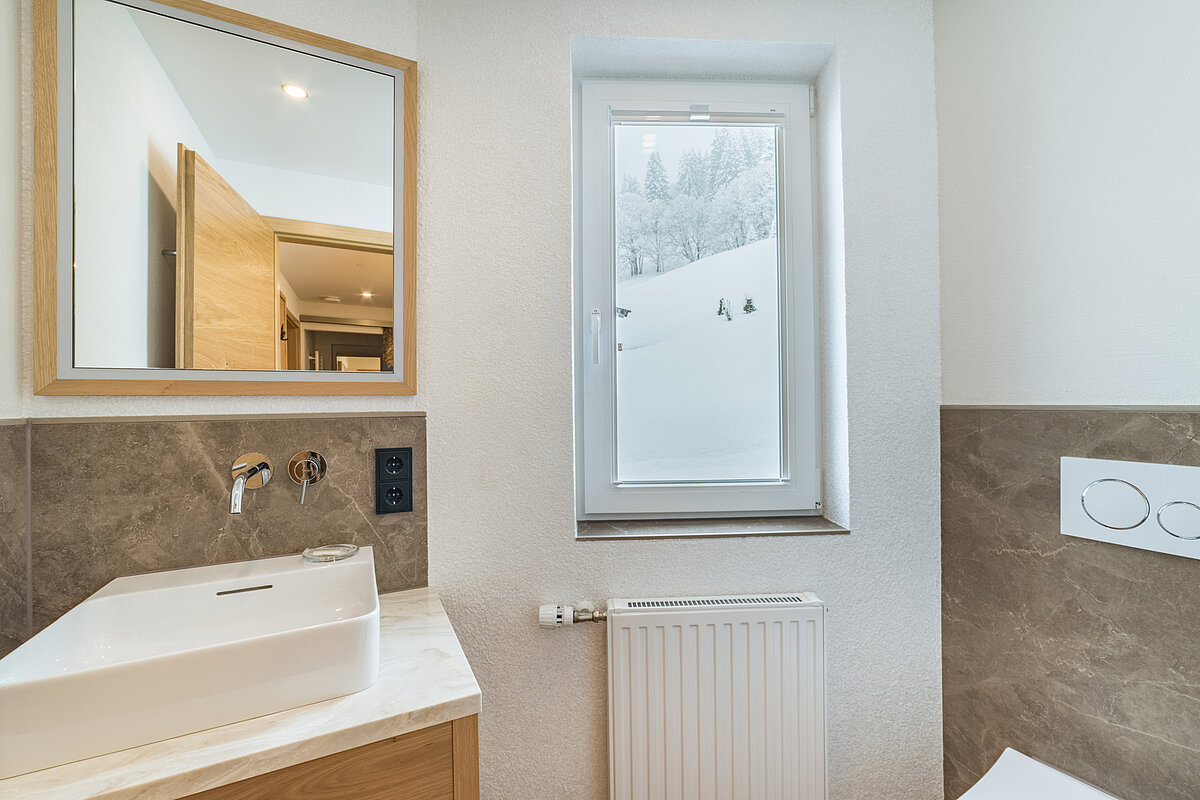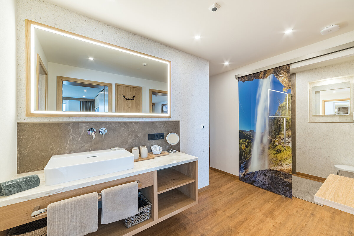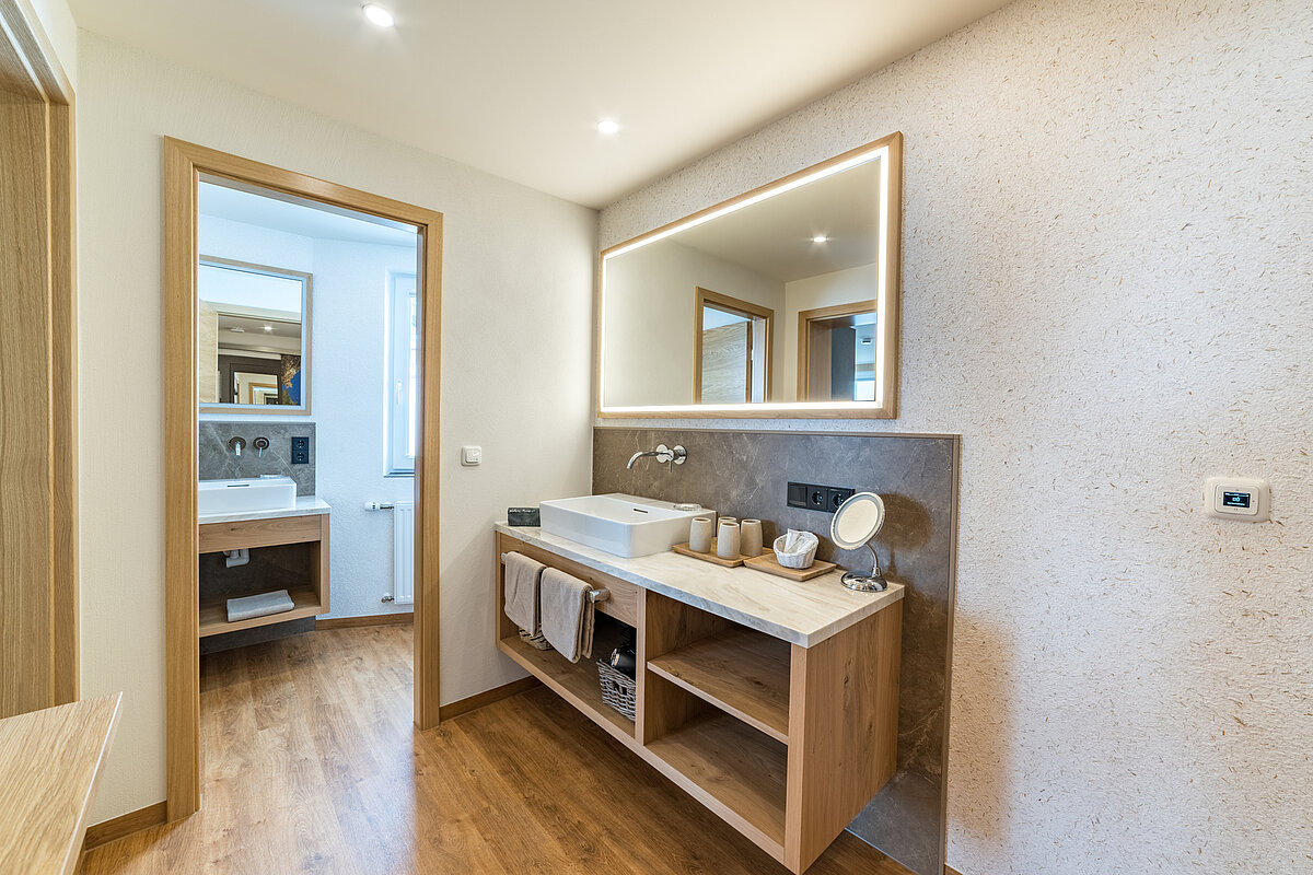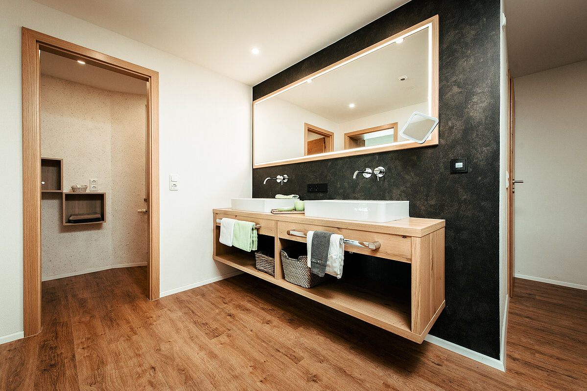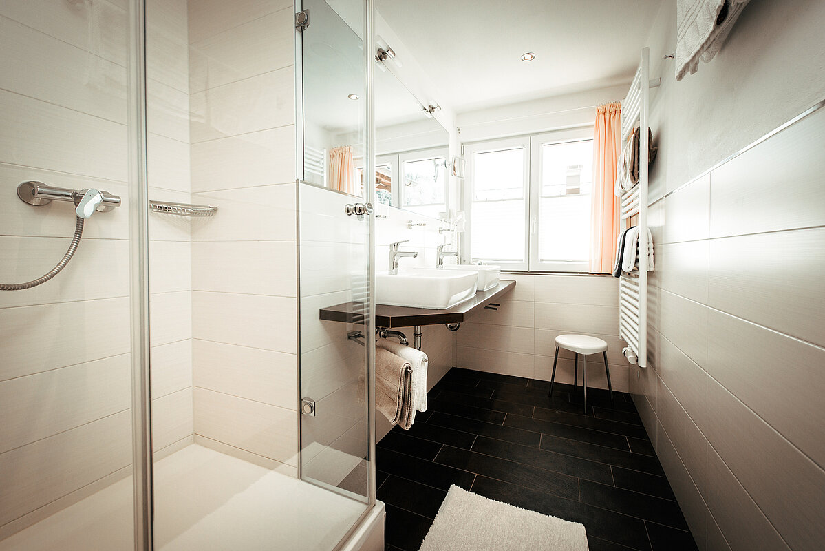 - badkamer met douche, dubbele wastafel en haardroger, apart toilet