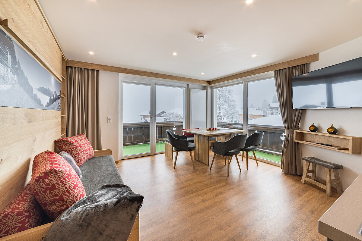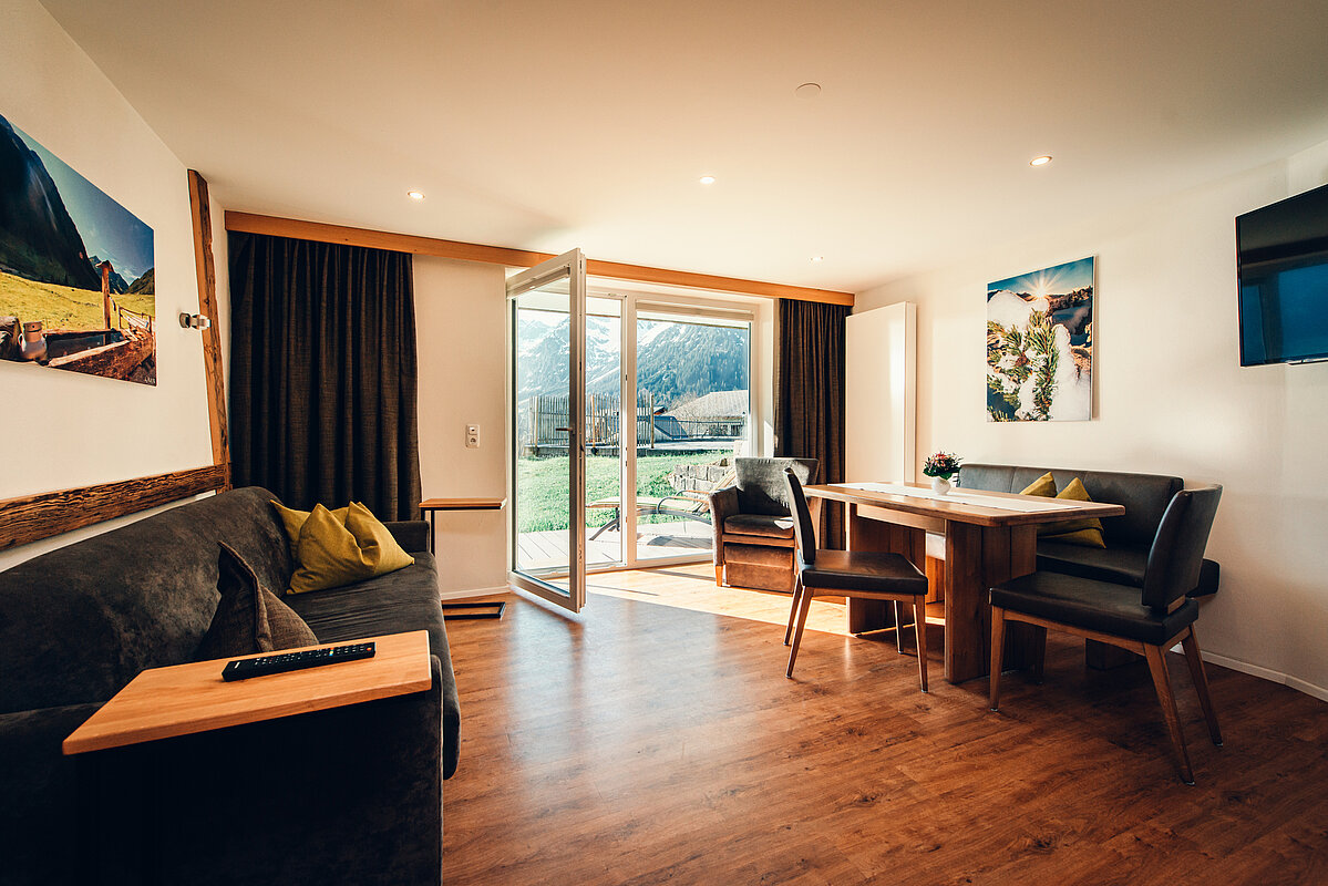 - ruime woonkamer met zithoek, panoramavenster, dubbele slaapbank
