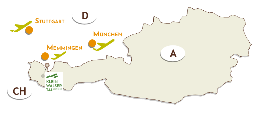 Von diesen Flughäfen können Sie mit Mietwagen oder öffentlichen Verkehrsmitteln nach Oberstdorf gelangen. Ab Oberstdorf nutzen Sie wie oben beschrieben den Bus ins Kleinwalsertal bis nach Mittelberg.